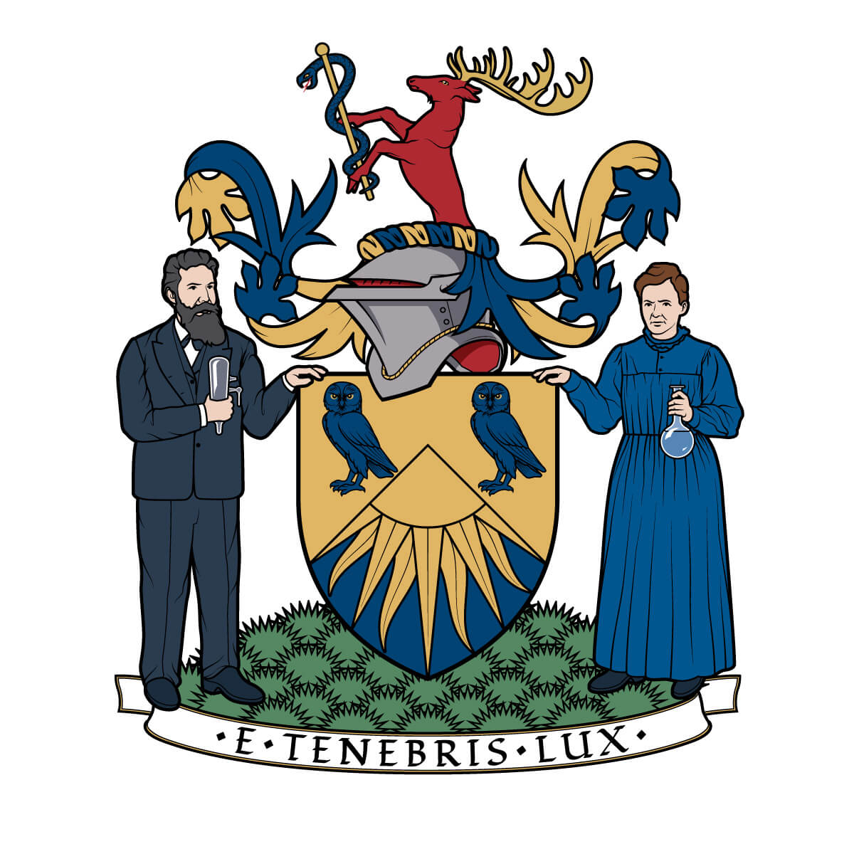 Supporters: Dexter a Man representing Wilhelm Röntgen habited in a shirt Argent a suit of clothes and shoes Sable holding in his exterior hand a Crookes tube proper Sinister a Woman representing Marie Skłodowska Curie habited in a dress Azure and shoes Sable and holding in her exterior hand a round-bottomed Glass Flask proper both on a Compartment of Grass Vert.